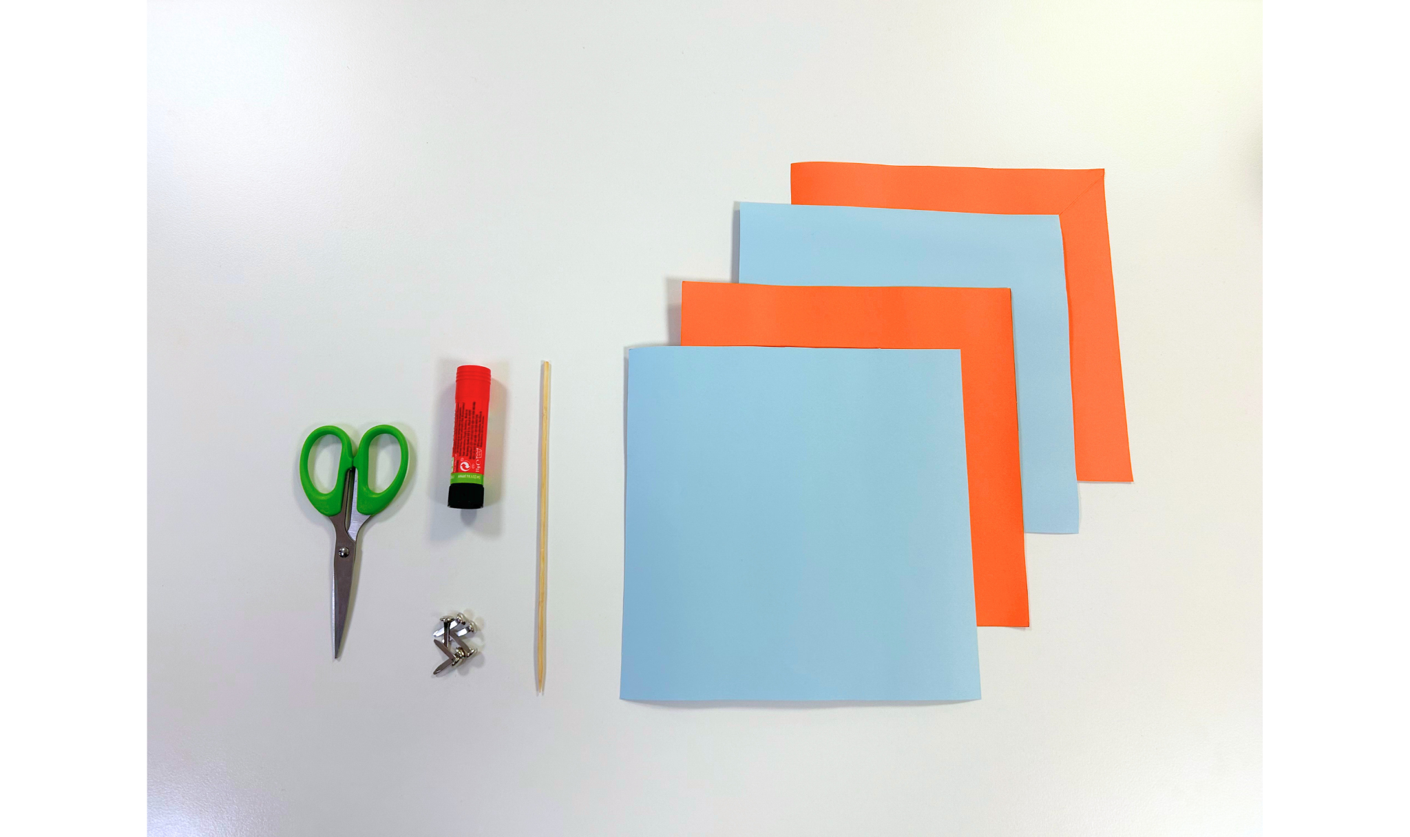 Lo primero es reunir todo lo que necesitas. Recorta cuatro cuadrados de papel o cartulina. Para los más pequeños, recomendamos usar papel más fino, ya que es más fácil de manejar. Si quieres un molino vistoso, elige folios de colores o con diseños llamativos.