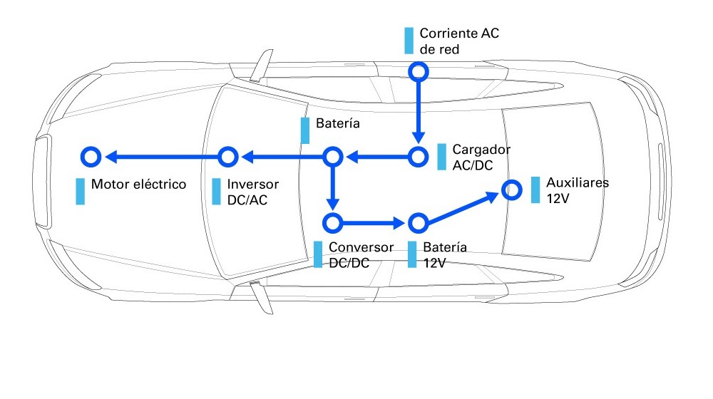El conversor transforma la alta tensión de corriente continua, que aporta la batería principal, en baja tensión de corriente continua. Este tipo de corriente es el que se utiliza para alimentar las baterías auxiliares de 12 V, que son las que alimentan los componentes auxiliares eléctricos del coche.