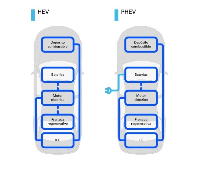 En este tipo de coches, el motor eléctrico y el de combustión se van alternando para ofrecer mejor rendimiento y mayor eficiencia. Tienen su depósito de combustible, pero también hay que cargarlos en una red externa. Su ventaja principal es que permiten realizar trayectos largos con un nivel bajo de emisiones.